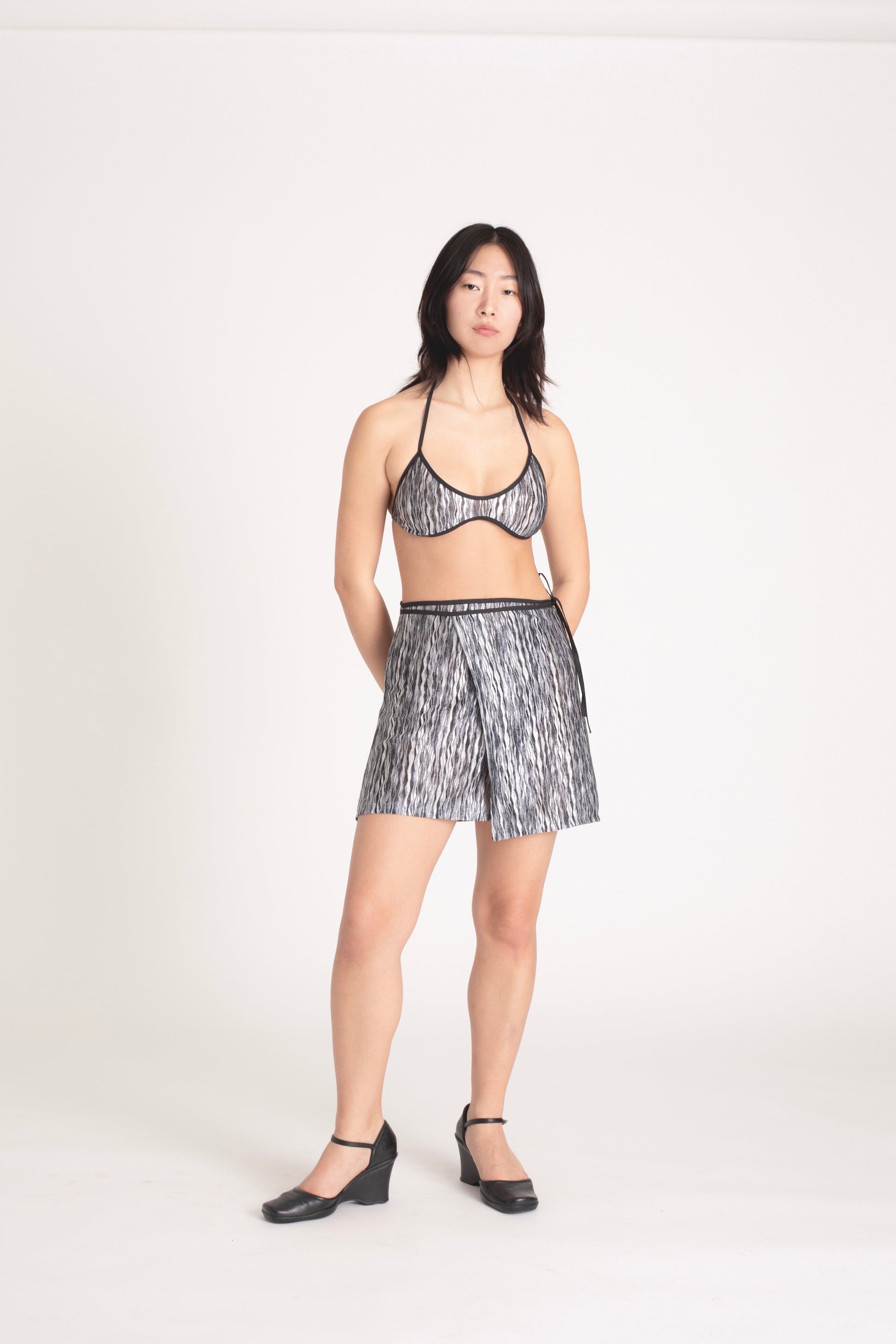 Wrap skirt with side closure that sits high waisted and at middle thigh.
