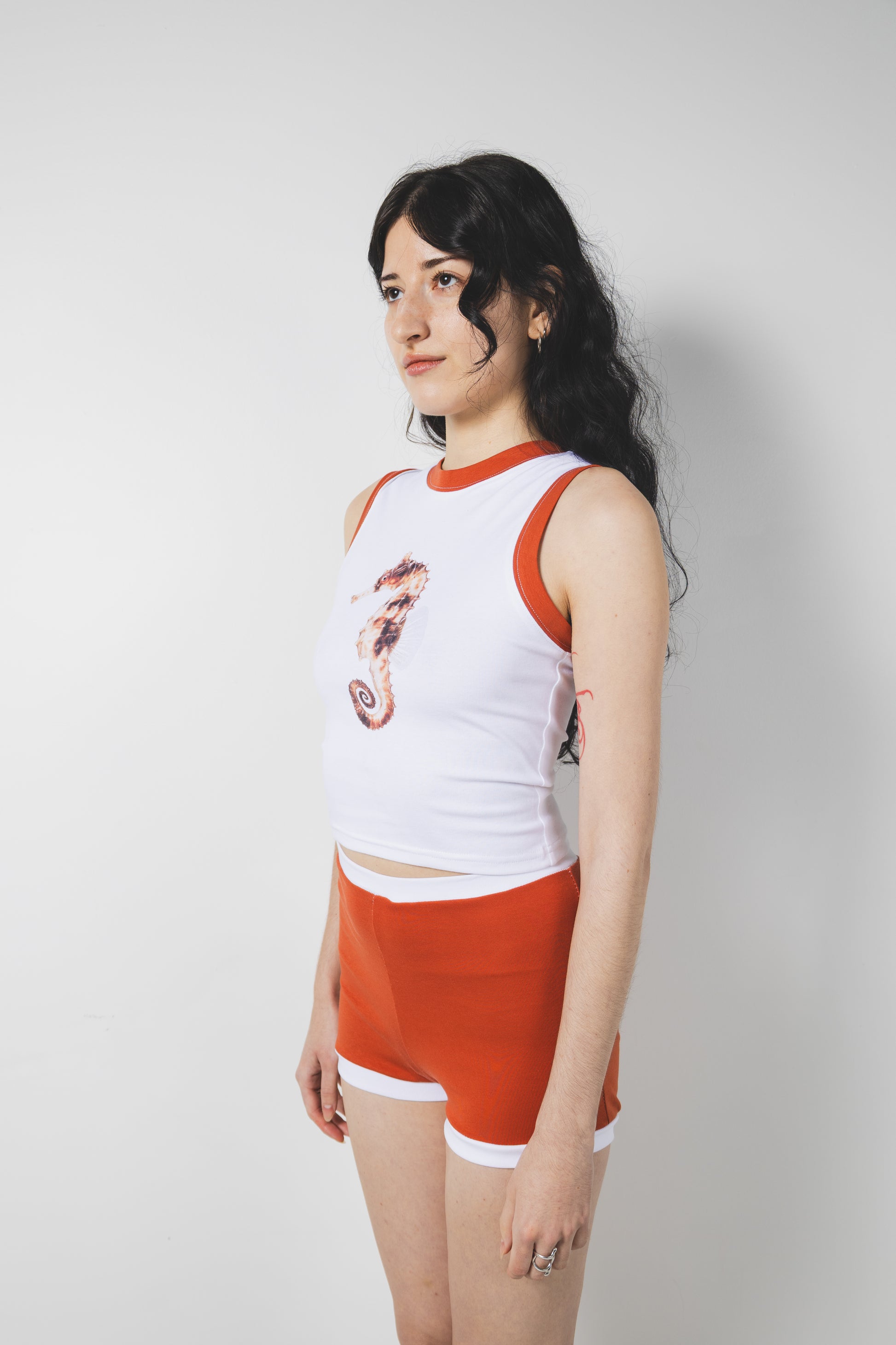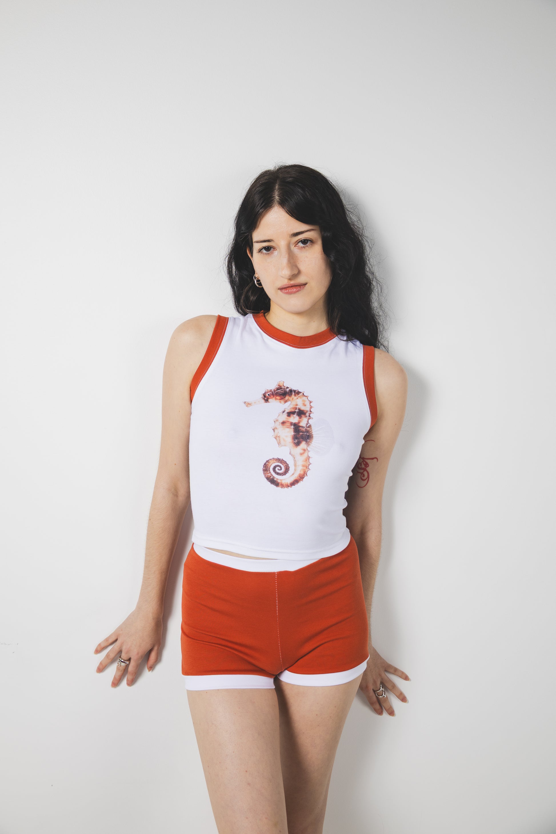The custom seahorse artwork is done using direct to garment printing, which means it won't fade in the sun or with every day wash.