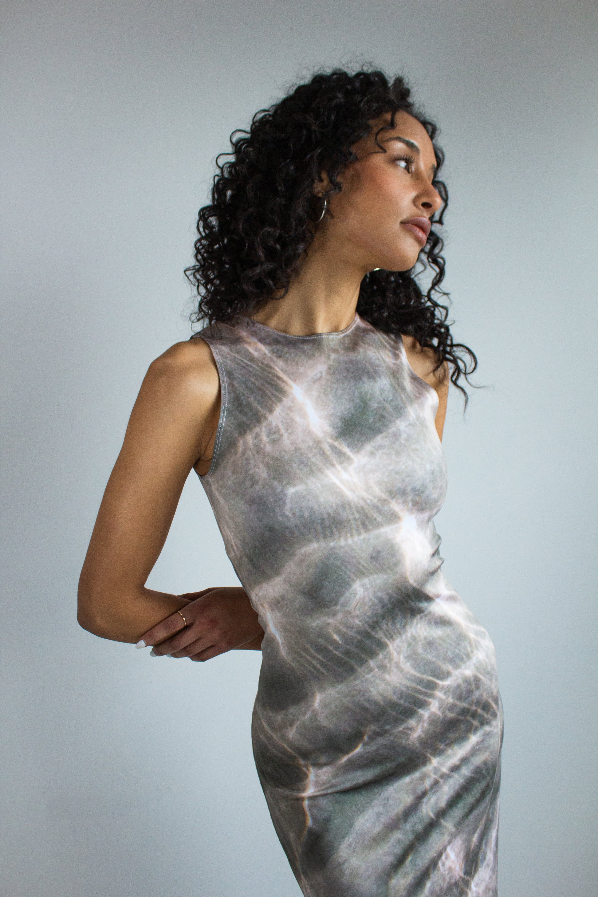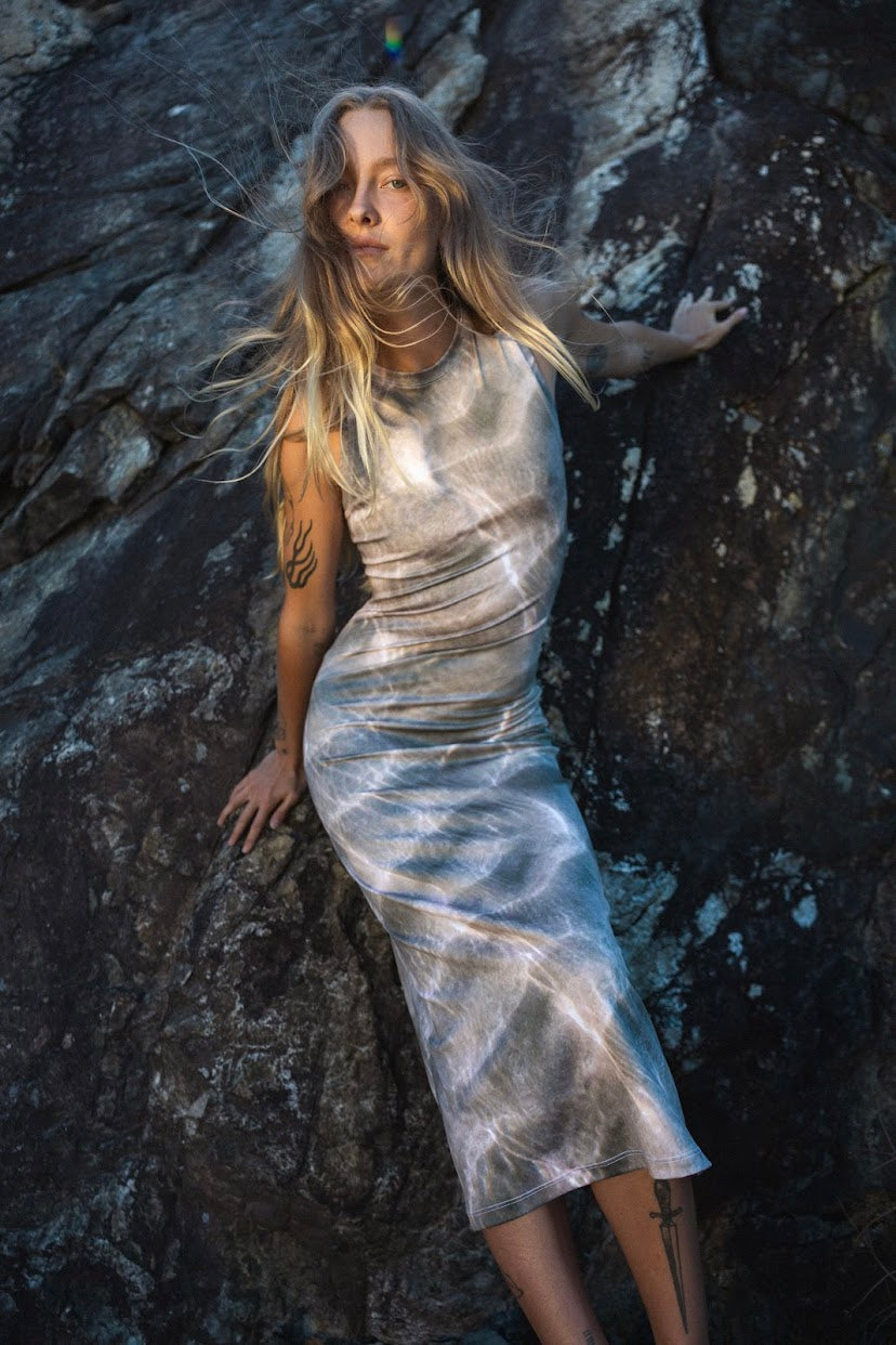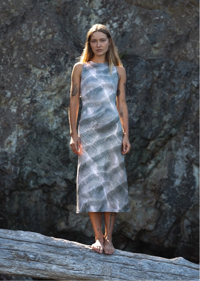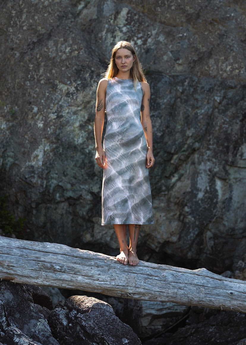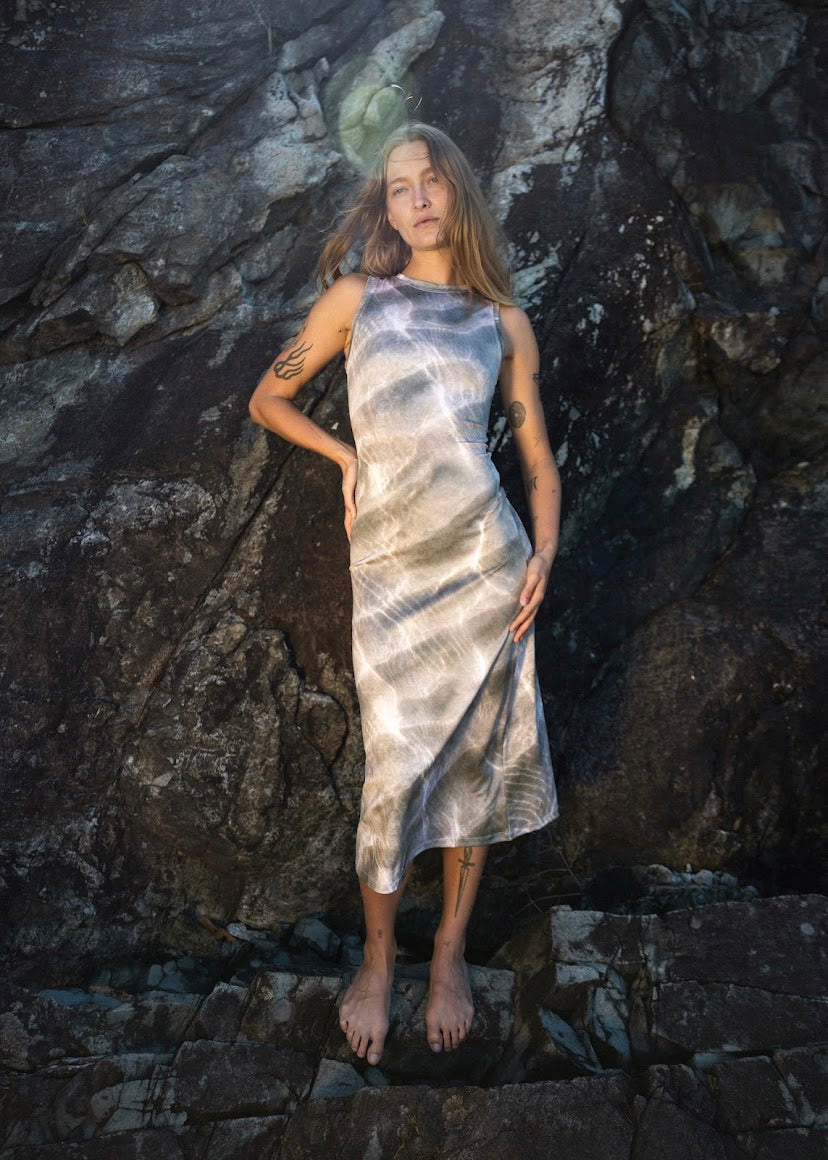 Introducing the Waves High Neck Midi Dress. The feeling of a long summer day at the beach. The tide is out, the wind is brushing over your skin, and you can feel the salt from the ocean tighten on your face. Maybe you even have a sunburn.