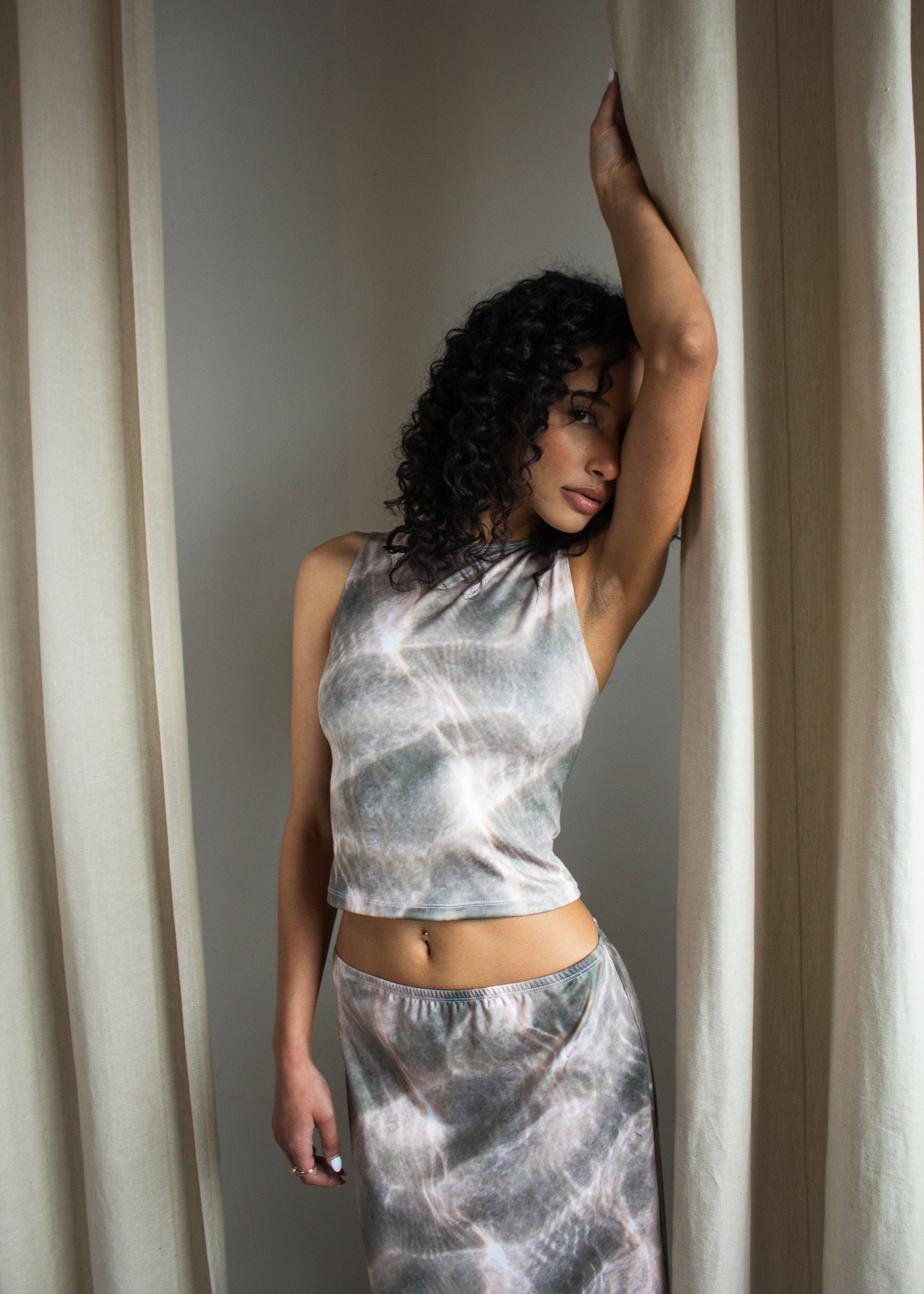 Introducing the Waves High Neck Tank. The feeling of a long summer day at the beach. The tide is out, the wind is brushing over your skin, and you can feel the salt from the ocean tighten on your face. Maybe you even have a sunburn.